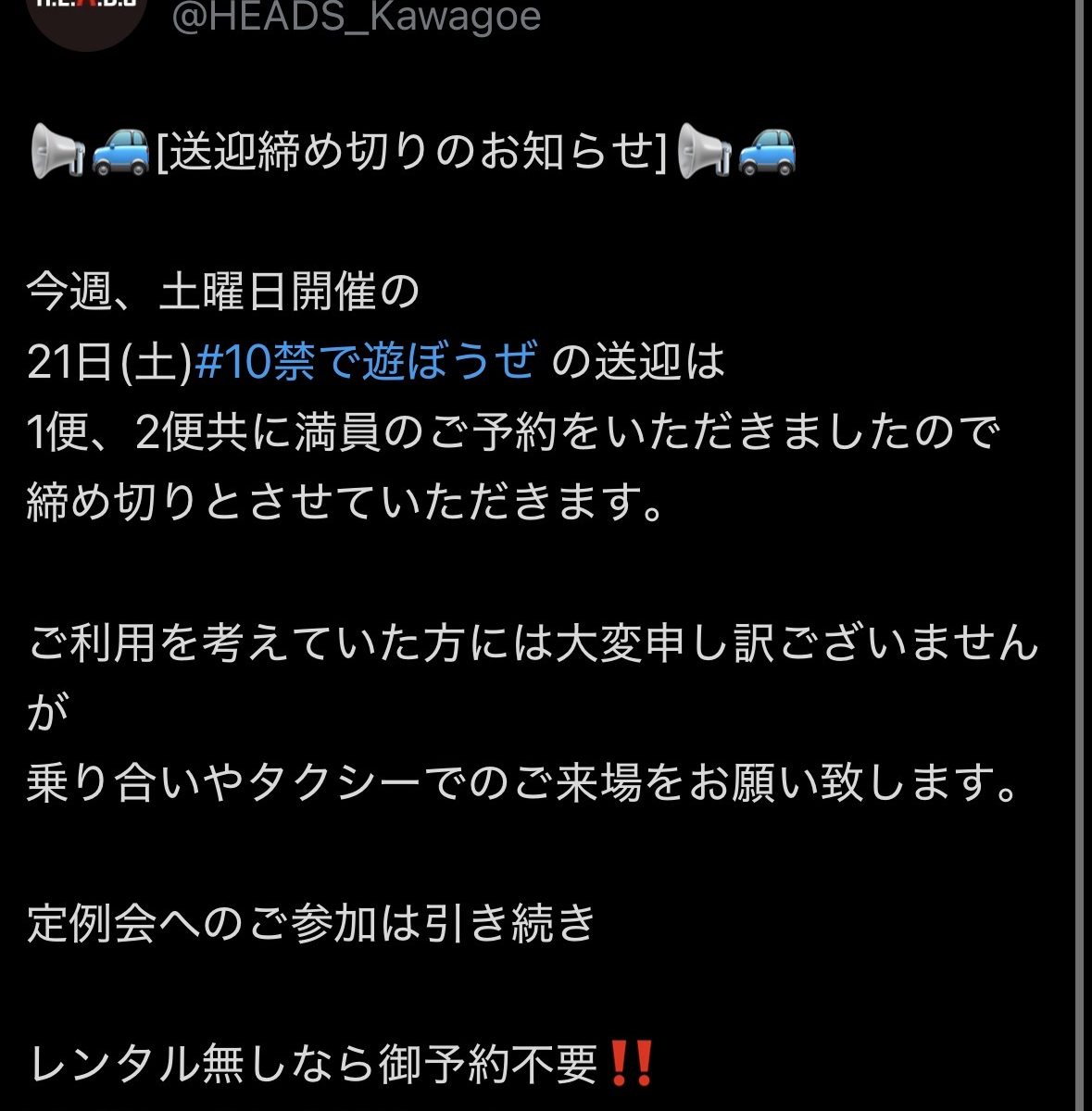 3月21日(土)開催予定の『10禁であそぼうぜ』の送迎は1便2便共に満員のご予約をいただきましたので送迎に関しては締切とさせていただきます。
